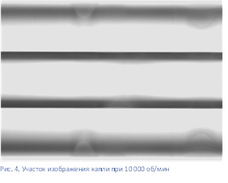 Изменение скорости вращения капли может влиять на удлинение капли. Форма капли становится более цилиндрической при высоких скоростях вращения. Различные формы капель для системы ПАВ-масло при скоростях вращения 6000 и 10000 об/мин показаны на рис.3 и рис.4. Программное обеспечение позволяет рассчитать межфазное натяжение между фазами по участкам изображения. Если вытянутая капля больше, чем отображаемый участок капли, можно рассчитать межфазное натяжение, анализируя левый и правый концы капли, или даже цилиндрическую среднюю часть капли на соответствующих участках изображения.