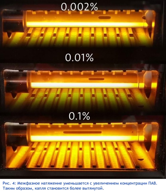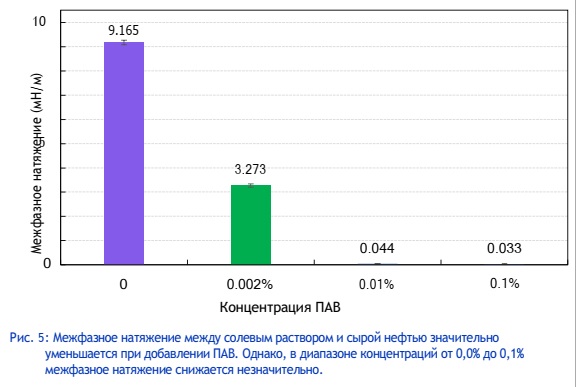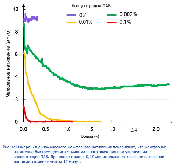 С помощью видеотензиометра SVT от DataPhysics Instruments можно определить сверхнизкое межфазное натяжение между солевым раствором, обработанным ПАВ, и сырой нефтью. При концентрации ПАВ 0,01% было достигнуто достаточно низкое межфазное натяжение равное 0,044 мН/м. При увеличении концентрации ПАВ до 0,1% межфазное натяжение изменяется с 0,011 до 0,033 мН/м. Однако, добавление ПАВ привело к более быстрому уменьшению межфазного натяжения: от 45 минут при 0,01% до менее чем 10 минут при 0,1%.
