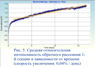 1-я секция оценивается с помощью программы Value Analysis Method MSC. На диаграмме (рис. 5) представлена зависимость средней интенсивности этой секции от времени. Значительный рост интенсивности обратного рассеяния может наблюдаться в течение первого дня. Начиная со второго дня, можно обнаружить небольшое увеличение интенсивности, которое является постоянным в течение остальной части эксперимента со скоростью 0,04% в день. Сильный рост, наблюдаемый в течение первого дня измерения, связан с уменьшением количества пузырьков воздуха, первоначально рассеянных в образце. Эти пузырьки появились во время встряхивания сосуда до начала измерения, а затем они мигрировали к поверхности образца. Незначительное, но постоянное увеличение интенсивности обратного рассеяния, наблюдаемое в 1-м разделе, происходит почти по всей высоте образца. Это может быть объяснено изменением размера частиц одного или нескольких компонентов, например, за счет процесса агломерации. Рассеивающая способность частиц зависит, среди прочего, от размера самих частиц[2].