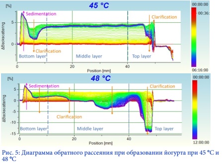 Для лучшего понимания влияния температуры на процесс гелеобразования и, следовательно, на качество йогурта, образование йогурта также было протестировано при 45 °C и 48 °C. Как показано на рис. 5, интенсивность обратного рассеяния сначала глобально увеличивается, а затем уменьшается со временем, особенно при более высокой температуре (48 °C). Это указывает на то, что гелевая сеть сформирована, но она, возможно, повреждается со временем при высокой температуре. Это согласуется с наблюдениями в конце измерений. Можно увидеть четкое разделение фаз в верхнем слое образца при 48 °C (рис. 2 слева); частицы йогурта, образовавшиеся при 48 °C, крупнее и тверже, что отрицательно влияет на текстуру йогурта (рис. 2 справа).