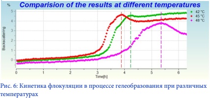 Благодаря функции наложения программного обеспечения MSC, разница между процессами гелеобразования при разных температурах может быть отображена прямо и просто. На рис. 6 показано, что мицеллы казеина коагулируют быстрее и точка гелеобразования наступает раньше, если процесс проводится при соответствующей температуре (45 °C), что полезно для оптимизации температуры для процессов ферментации.